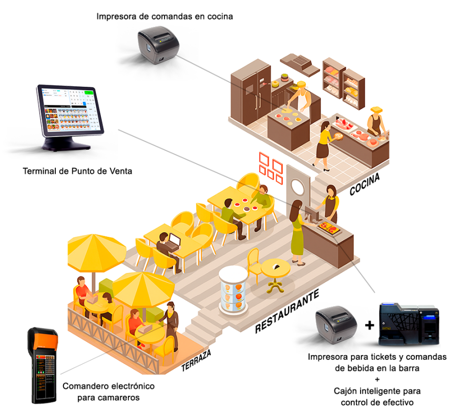 venta, comandas de cocina y recibos, reduciendo tiempos de espera y mejorando la atención al cliente.